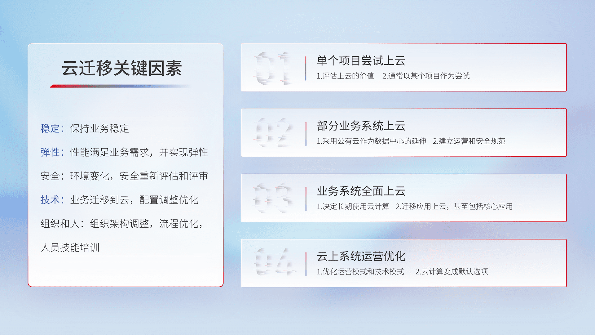 结合实际业务,,从规划设计、、、云平台选型、、云原生改造、、数据迁移、、、、集成交付,,迁移全过程为客户识别最佳上云路径,,,做好风险识别管理,,,设计网络架构、、、身份权限、、、、安全审计合规、、、操作审计、、、日志审计、、、、监控告警策略、、多站点容灾设计等,,对云上基础设施进行整体规划,,,,提升IT治理水平,,,以满足弹性、、高可用、、、、高性能的需求。。。
