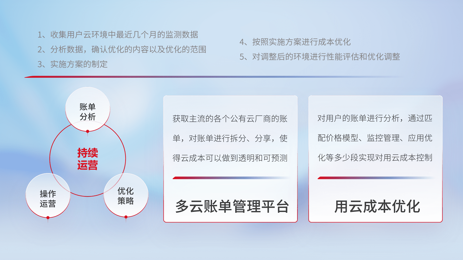通过多云纳管,,以统一的资源数据模型把客户的云资源进行抽象和封装,,,进而实现对多云资源的统一操作,,保障云资源管理的可靠性、、、稳定性与可用性。。量身定制化运维内容,,配置、、、、开发运维、、补丁管理、、备份、、、、监控、、、、认证和访问管理、、、审计和日常巡检等,,保障在用云过程中的可靠度,,,稳定度以及高可用率。。。