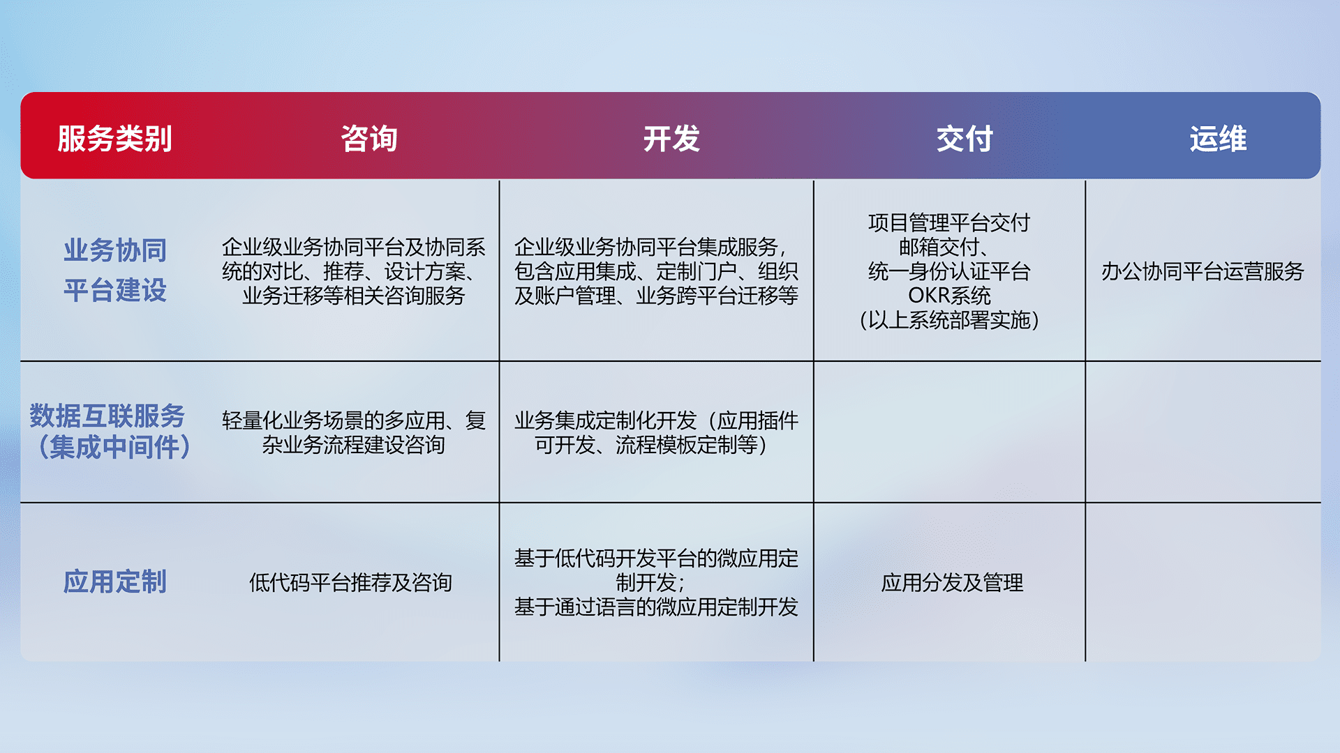 针对钉钉、、企微、、、IDaas等平台级产品提供产品的规划、、、方案、、、、交付、、、定制化开发等服务,,,实现如统一协同办公、、智能客户服务、、混合会议管理、、智能数据查询、、、等业务场景,,实现数字化转型。。。
